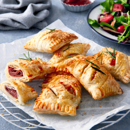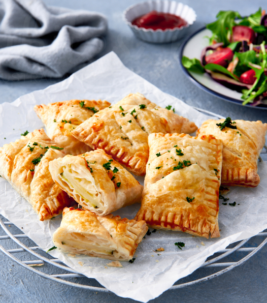 Flaky puff pastry pockets stuffed with seasonal vegetables, potatoes, and cheese.